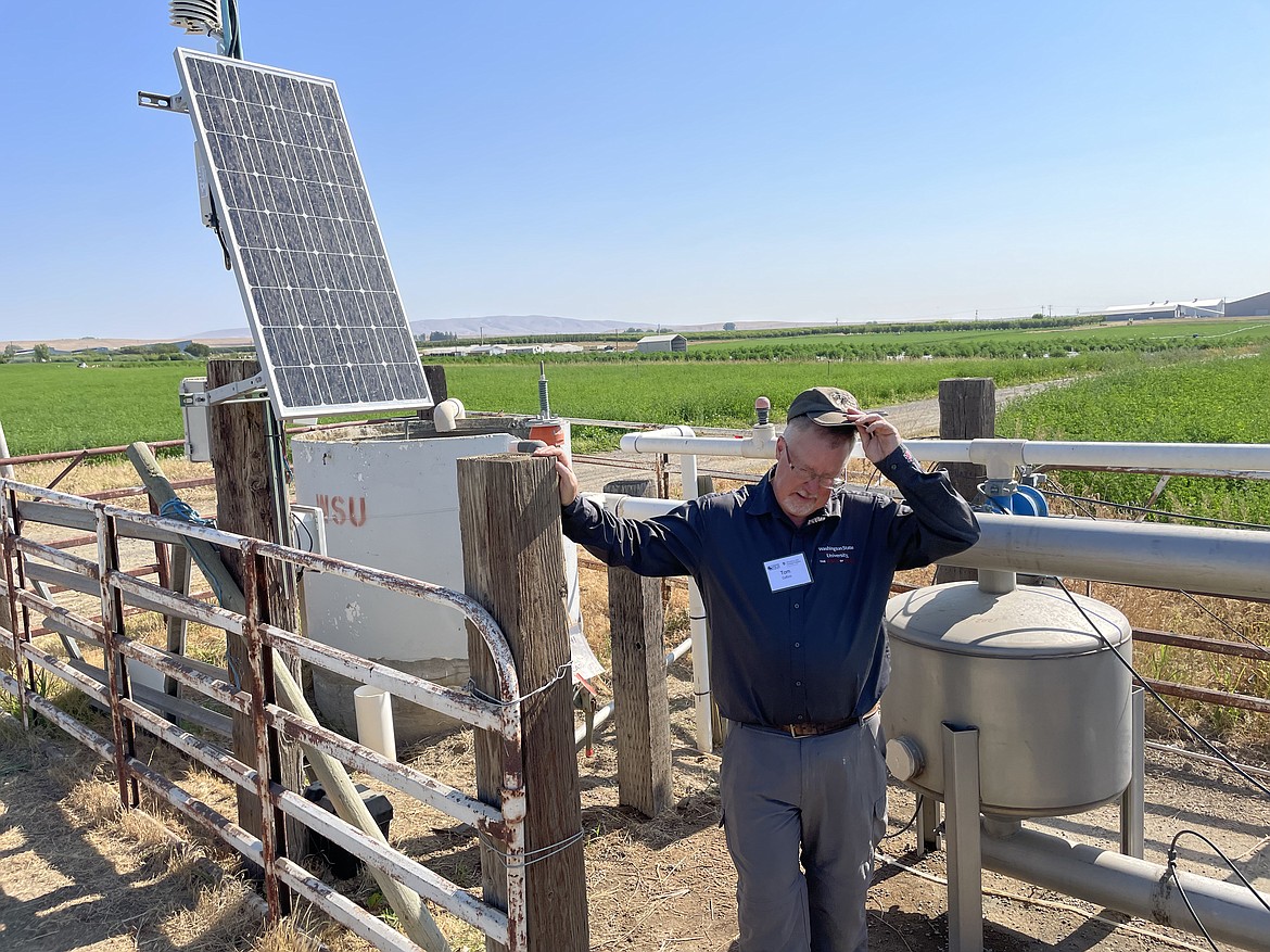 Underneath a hot Yakima Valley sun in late July at WSU’s Irrigated Agriculture Research and Extension Center Roza Farm, amidst the grapes, the hops, the hemp and the alfalfa, he stands in front of a smoker, out of which extends a long, black flexible tube — like a dryer vent hose, only scores of feet longer and strung through several rows of grape vines.