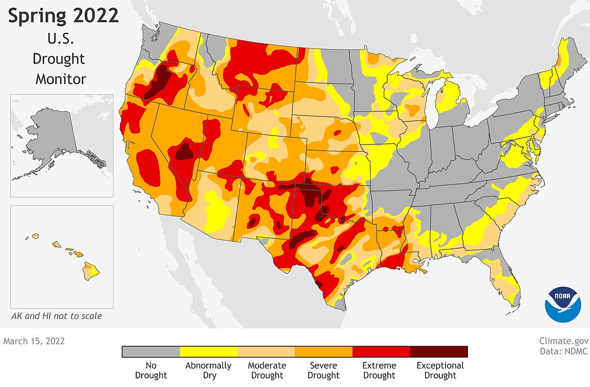 “With nearly 60% of the continental U.S. experiencing minor to exceptional drought conditions, this is the largest drought coverage we’ve seen in the U.S. since 2013,” Gottschalck said.